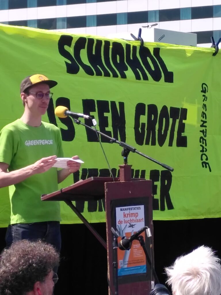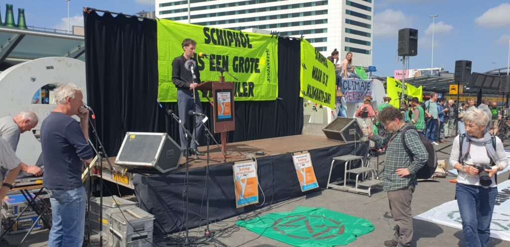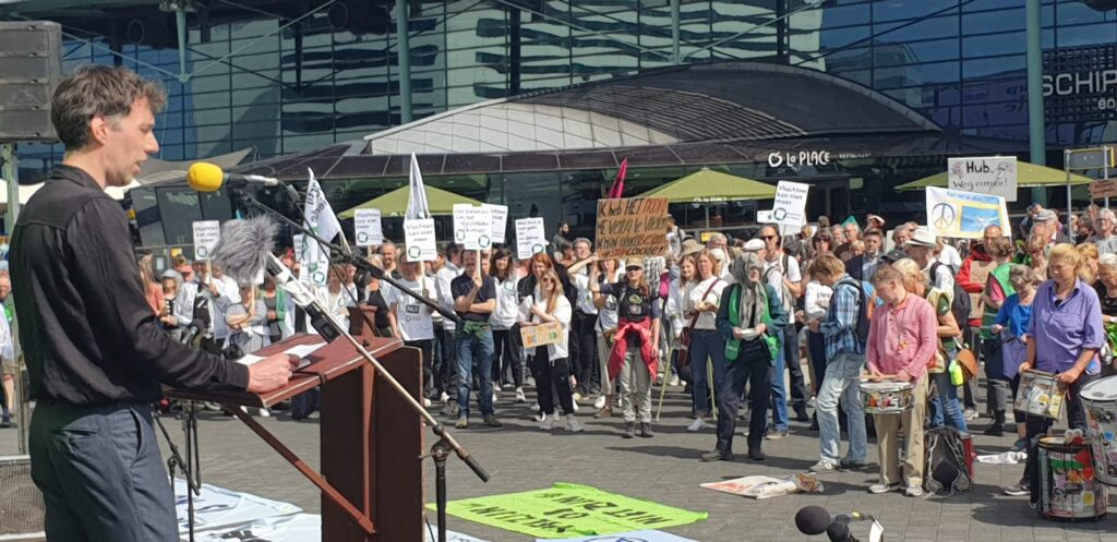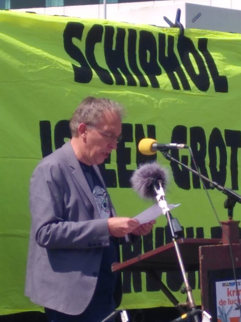 Sijas Akkerman, directeur Natuur en Milieufederatie Noord-Holland was een van de vele sprekers en sprak de menigte toe: ‘Schiphol piept en kraakt aan alle kanten. Het is nu tijd om in te grijpen. Schiphol terug naar maximaal 350.000 vluchten.’