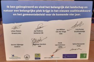 Als afsluiter kregen de raadsleden de mogelijkheid om een ‘blanco cheque’ te tekenen. Die luidde als volgt: “Ik ben geïnspireerd en vind het belangrijk dat landschap en natuur een belangrijke plek krijgt in het nieuwe coalitieakkoord en het gemeentebeleid voor de komende vier jaar”. Van de coalitiepartijen tekent alleen SHK. CDA en VVD tekenden niet, maar voelden zich wel geïnspireerd en de deur staat open voor gesprek.