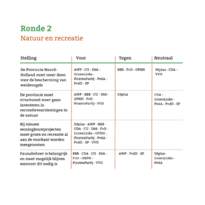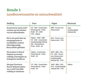 We legden stellingen voor aan de lijsttrekkers over de landbouwtransitie, biodiversiteit, recreatie en ruimtegebruik. Een aantal kandidaten gingen vervolgens met elkaar over het betreffende onderwerp in debat. De overige kandidaten gaven met rode en groene briefjes aan of ze het eens of oneens zijn met de stelling. Tussen de stellingen door legde Sijas Akkerman, directeur van de Natuur en Milieufederatie Noord-Holland, vragen uit het publiek voor aan de kandidaten.