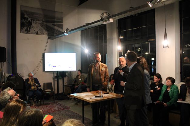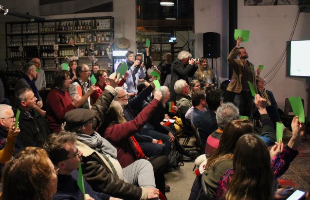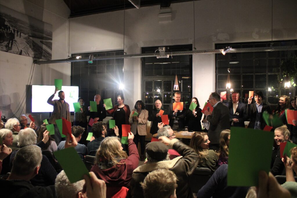 Politici en burgers met elkaar in gesprek tijdens politiek café