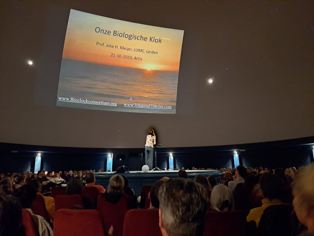 Prof. Dr. Joke Meijer, van het Bioclock Consortium, betrad na de pauze het podium en presenteerde boeiende inzichten over de invloed van duisternis op onze gezondheid. Haar lezing bood een perspectief op de connectie tussen onze biologische klok en de duisternis.