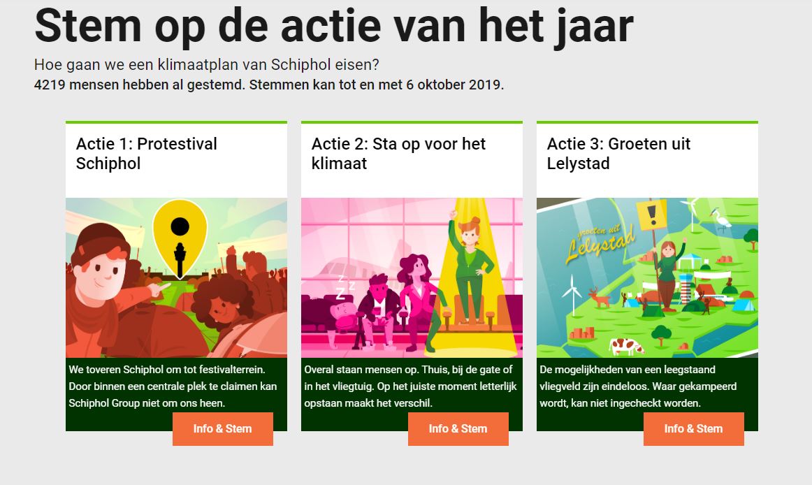 Ook ontwikkelden we de site Eerlijk over vliegen waarop alle feiten over het vliegen zijn verzameld. Geen valse claims, wel eerlijke metingen en heldere analyses van uitspraken door de luchtvaartsector en politiek. Als we eerlijk zijn over vliegen, dan kunnen we alleen maar concluderen dat het vliegverkeer in Nederland niet verder kan groeien.